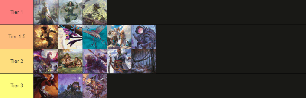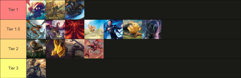 - Tier 1,5: Temur Draghi, Mardu Mobilize, Mono Rosso Aggro, Boros Topini, Simic ETB, Mono Verde Landfall, Rakdos Warp.